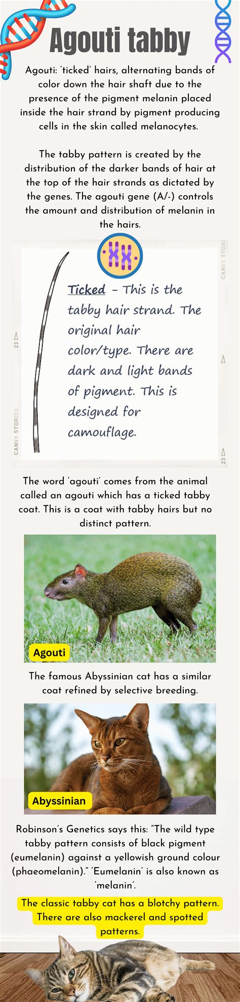 Now, let’s talk about the ‘tabby’ part. Tabby isn’t a breed, but rather a coat pattern that’s incredibly common in cats. There are four main types of tabby patterns, and the agouti gene plays a crucial role in how these patterns are expressed. We’ve got the mackerel tabby , which looks like a fish skeleton with narrow, parallel stripes running down its sides. Then there’s the classic tabby (also known as a blotched tabby), which has bold, swirling patterns, often resembling a bullseye on its sides. The spotted tabby is pretty self-explanatory – it has spots all over, which can be large or small, round or oval. Finally, we have the ticked tabby , and this is where our agouti friend shines! In a ticked tabby, the tabby pattern is primarily expressed in the ‘agouti’ hairs, meaning you see those bands of color on most of the body, with minimal striping on the legs and tail, and a distinct ’M’ marking on the forehead. Even in other tabby patterns, like mackerel or classic, the agouti gene is usually present, contributing to the overall richness and variation of the colors within the stripes and swirls. It’s this interplay between the agouti gene and the genes responsible for the specific tabby pattern that creates the stunning diversity we see in our tabby cats. So, while all tabbies have a common ancestor and share genetic markers, the way these genes express themselves can lead to a whole spectrum of beautiful coats.