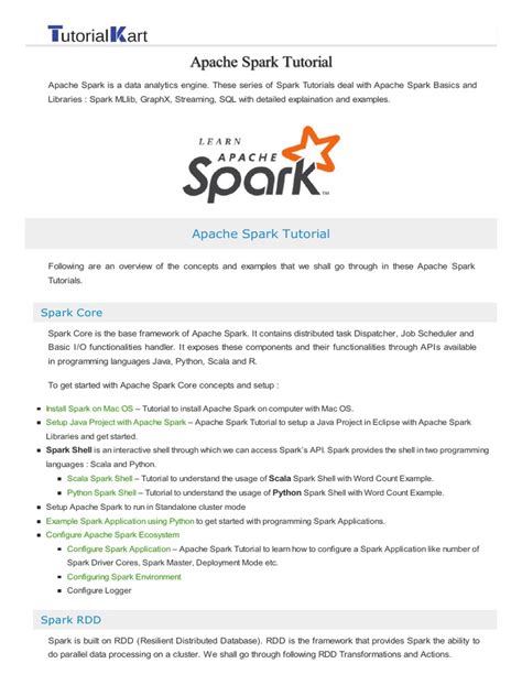 • Apache Spark Documentation: The official Apache Spark documentation includes a wealth of information about Spark, including tutorials, examples, and API documentation. While it may not be in PDF format, you can easily print the relevant sections to create your own PDF tutorial.