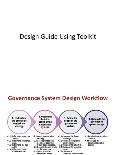 First up, you’ve got the Design Guides . These are your main guides, providing detailed explanations and step-by-step instructions on how to design and implement various aspects of your IT governance system. They cover everything from setting up your governance framework to managing specific IT processes. Think of them as the expert advice you need to avoid common pitfalls. Next, we have Templates . Need a starting point? The toolkit offers a range of templates, from risk assessment frameworks to process documentation. These templates are super helpful, saving you time and effort by providing a solid foundation to build upon. And then, there are the Practical Examples . The toolkit also includes real-world examples to help you understand how to apply the framework in different scenarios. These examples are incredibly valuable for seeing how the principles translate into practice and for getting ideas for your own implementation.