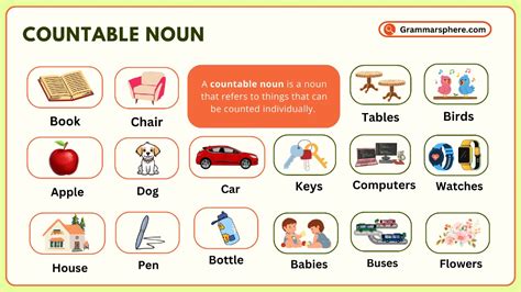 To really nail down the concept, let’s look at some real-world examples of countable nouns . Seeing these nouns in action will help you understand how they function in sentences and how to use them correctly. First off, let’s consider common objects. Think about items you see around your house or in your everyday life. Tables , chairs , lamps , phones , and computers are all countable nouns. You can easily count them: “one table,” “two chairs,” “three lamps,” “four phones,” “five computers.” Notice how each of these nouns has a clear singular and plural form, making them easy to quantify. Next, let’s think about people and animals. People , children , teachers , doctors , cats , dogs , and birds are all countable. You can say “one person,” “two children,” “three teachers,” “four doctors,” “five cats,” “six dogs,” and “seven birds.” Again, the ability to count these nouns is straightforward. Even abstract ideas can be countable in certain contexts. For example, ideas , plans , thoughts , dreams , and reasons can be countable. You can have “one idea,” “two plans,” “three thoughts,” “four dreams,” and “five reasons.” Although these concepts are not tangible, they can still be quantified. Another category to consider is events or occurrences. Meetings , parties , concerts , games , and classes are all countable. You can say “one meeting,” “two parties,” “three concerts,” “four games,” and “five classes.” These nouns represent specific events that can be counted individually. To illustrate further, consider these sentences: “I have three books in my bag.” “She saw two birds in the park.” “There are many students in the classroom.” “He has a few ideas for the project.” “We attended several meetings last week.” In each of these sentences, the countable nouns are used with appropriate articles or quantifiers, and they have distinct plural forms. By recognizing and using countable nouns correctly, you’ll enhance the clarity and precision of your writing and speech. So, keep practicing and paying attention to the context in which these nouns are used!