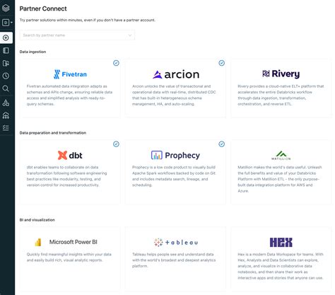 Once you’re in the Partner Connect interface, you’ll see a list of available partner solutions. These are tools and services that have been pre-integrated with Databricks to make your life easier. Take some time to browse through the list and explore the different categories, such as data ingestion, business intelligence, and machine learning. Each partner listing typically includes a brief description of the tool and its capabilities, so you can get a sense of what it does and whether it’s a good fit for your needs. Also, keep an eye out for any featured partners or special offers that may be available.