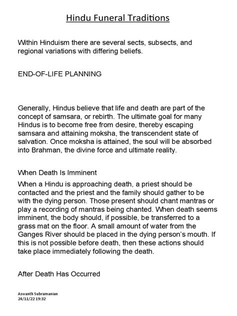 Before the funeral rites commence, there are specific preparations that take place, all imbued with spiritual meaning. When a Hindu individual is nearing the end of their life, family members often ensure they are comfortable and surrounded by loved ones. They may recite prayers, hymns, or the names of deities to create a sacred and peaceful atmosphere. It’s believed that a calm and spiritually charged environment helps the departing soul transition more easily. Once death occurs, the body is typically washed and dressed in clean, often white, garments. This act of purification is symbolic of cleansing the soul for its onward journey. The body is then placed on a bier or a simple cot, often adorned with flowers. It’s important to note that in many Hindu traditions, the body is not embalmed or kept for an extended period, as prompt cremation is generally preferred. This is to prevent the soul from becoming too attached to the physical form and to facilitate its swift departure. During this time, the family might keep a lamp ( diya ) lit near the body, symbolizing the eternal flame of life and the presence of the divine. Relatives and friends gather to pay their respects, offering prayers and sharing memories. While grief is natural, the emphasis is often on acceptance and devotion, remembering the person’s life and their spiritual journey. The preparation phase is a delicate balance between mourning the loss of the physical presence and celebrating the soul’s liberation. It’s a time for the community to come together, offering support and participating in the sacred rituals that honour the departed and guide their spirit. The rituals surrounding the preparation are not just about the body; they are about setting the stage for the soul’s transition, ensuring it is met with peace and spiritual readiness. The focus remains on the belief that the soul is eternal, and this transition is a necessary part of its grander cosmic journey, making these preparations a vital act of love and spiritual duty. The rituals are deeply rooted in ancient Vedic traditions, aiming to purify the body and soul, and to create a conducive environment for the soul’s journey towards its next spiritual destination. This period is marked by a profound sense of respect for the deceased and a deep commitment to fulfilling their spiritual needs during this critical transition. The family’s role is paramount, guiding the process with faith and adhering to age-old customs that have provided comfort and meaning for countless generations. The ultimate aim is to ensure the soul departs with peace, dignity, and spiritual grace, ready for whatever lies ahead in its eternal existence.