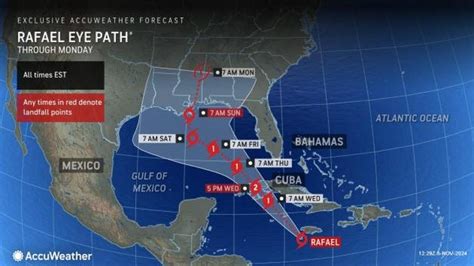 Now, let’s zoom in on Hurricane Rafael’s path . Please keep in mind that the situation can change rapidly, and this is based on the most current information available, but as you know, it is a dynamic situation that can change at any moment. For the most up-to-date details, always check with the NHC or other official weather sources. Typically, when a hurricane is forming, meteorologists will start with its initial location. They’ll track its movement over time, noting its speed and direction. The path is often displayed as a line on a map, with key points showing the storm’s position at specific times. The intensity of the storm, which is based on wind speeds, is also an important factor. The Saffir-Simpson Hurricane Wind Scale is used to classify hurricanes based on their sustained wind speeds, from Category 1 to Category 5. The higher the category, the more severe the storm. The forecast path shows the predicted movement of the hurricane over the next few days. It’s important to remember that this is a forecast, not a guarantee, and there’s a certain degree of uncertainty involved. The cone of uncertainty is a visual representation of the potential path, which means the hurricane’s center will likely remain within the cone about two-thirds of the time. The cone gets wider further out in the forecast period.
