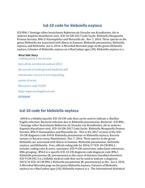 Finally, the moment we’ve all been waiting for: the specific ICD-10 code for Klebsiella pneumoniae sepsis . It’s important to understand that the code depends on the specific circumstances of the patient’s condition. The code for Klebsiella sepsis will depend on how severe the sepsis is and whether or not the patient is also experiencing septic shock. The code is structured in a way that helps to capture the nuances of the disease. Proper application of these codes is a must for ensuring accurate medical records and proper billing. So here’s the lowdown: