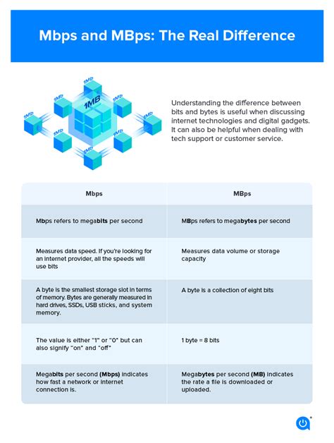 The biggest difference between Mbps and MBps lies in what they measure: bits versus bytes . Remember this: 1 byte is equal to 8 bits. This is the golden rule! So, to convert Mbps to MBps, you simply divide the Mbps value by 8. For example, if you have a 100 Mbps internet connection, your maximum download speed in MBps would be 100 / 8 = 12.5 MBps. Understanding this conversion is super helpful because download speeds are often displayed in MBps, while internet plans are advertised in Mbps. This difference is fundamental to understanding data transfer rates. A bit is the smallest unit of data in computing, representing a binary value of either 0 or 1. A byte, on the other hand, is a collection of 8 bits. Because of this relationship, it’s important to distinguish between the two when assessing network and storage performance. When you see internet speeds advertised in Mbps, it’s often a marketing tactic to make the numbers appear larger. However, when you’re downloading files or transferring data, the speeds are typically displayed in MBps. This can lead to confusion if you’re not aware of the conversion factor. Knowing that 1 byte equals 8 bits allows you to accurately calculate the expected download speed from your internet plan. For instance, if your internet plan offers 200 Mbps, you can divide that number by 8 to find the maximum download speed in MBps, which would be 25 MBps. This understanding helps you set realistic expectations and evaluate whether you’re getting the performance you’re paying for. In addition to network speeds, the distinction between bits and bytes is crucial in other areas of computing. For example, storage capacity is typically measured in bytes , while data transfer rates for network interfaces and memory are often specified in bits. Being able to convert between the two units is essential for comparing specifications and understanding the capabilities of different devices and technologies. In short, recognizing the difference between bits and bytes, and knowing how to convert between Mbps and MBps, is a fundamental skill for anyone working with computers and networks.