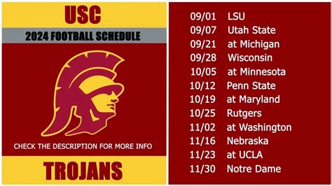 Wrapping up our iusc football schedule predictions , it’s clear the USC Trojans face a challenging but exciting season. Their success will depend on their ability to execute, adapt, and rise to the occasion. The team’s potential is undeniable, and with the right combination of talent, strategy, and determination, they could have a memorable season. The key will be consistency and the ability to perform under pressure. Expect the unexpected. Remember, college football is unpredictable! We’ve covered the early season, mid-season, and late-season games. Throughout the season, we’ll keep you updated with the latest news, analysis, and insights. Remember, this is just a prediction. The actual results will depend on various factors. We are here to prepare you for everything. The most important thing is to enjoy the ride. The USC Trojans have the potential to make a significant impact on the college football scene. We can’t wait to see what the season holds for the Trojans. It’s going to be a thrilling year, so get ready to cheer on your team! Let’s get this season started and make some memories. We’re all excited for the new season to begin, and hope the USC Trojans will show us a great display of the sport. We can’t wait to see you back on the field, and ready to compete for the win. We are all excited to see the team do well, so let’s start now!