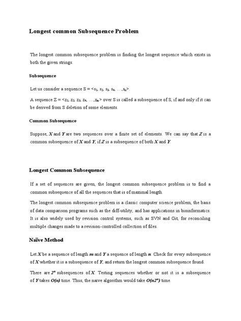 It’s super important to understand the difference between a subsequence and a substring . A substring is a contiguous (or continuous) part of a string. For example, “TAB” is a substring of “AGGTAB.” On the flip side, a subsequence doesn’t have to be continuous. “GTAB” is a subsequence of “AGGTAB” because the characters appear in the same order, even if they’re not next to each other. The core difference is that substrings are stuck together, whereas subsequences can be spread out. Think of it like this: A substring is like a group of friends standing in a straight line, while a subsequence is like friends scattered across a room, but they still appear in the order they were introduced. This difference has a major impact on how we solve the LCS problem. We can’t just slide a window across the string like we would with substrings. We need a more flexible approach that accounts for the potential gaps between the characters. The flexibility of subsequences makes the LCS problem more complex but also gives it a wider range of applications. Mastering this difference is key to understanding the problem and choosing the right approach to solve it. Ready to dive in? Let’s go!