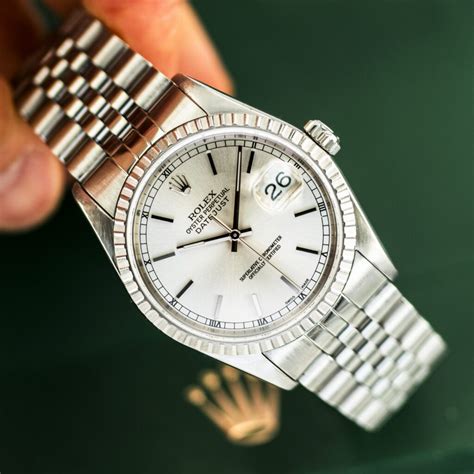 The Rolex 1601 boasts several key features that contribute to its enduring appeal. The 36mm case size is perfectly balanced, offering a comfortable fit on most wrists while maintaining a classic presence. The aforementioned fluted bezel is perhaps the most distinctive design element, catching the light and adding a touch of brilliance to the watch. The dial, available in a variety of finishes including silver, gold, and blue, provides excellent legibility and a clean aesthetic. The date window at 3 o’clock, magnified by the iconic Cyclops lens, is a practical and recognizable feature. Inside, the 1601 is powered by Rolex’s caliber 1565 or 1575 movement, both known for their accuracy and reliability. These movements are automatic, meaning they wind themselves with the motion of the wearer’s wrist, and are certified chronometers, ensuring exceptional timekeeping performance. The 1601 is typically fitted with either a Jubilee or Oyster bracelet, both of which are designed for comfort and durability. The Jubilee bracelet, with its five-piece link construction, offers a dressier look, while the Oyster bracelet, with its three-piece link design, is more sporty and robust. These design elements combine to create a watch that is both elegant and functional, making it a true classic.