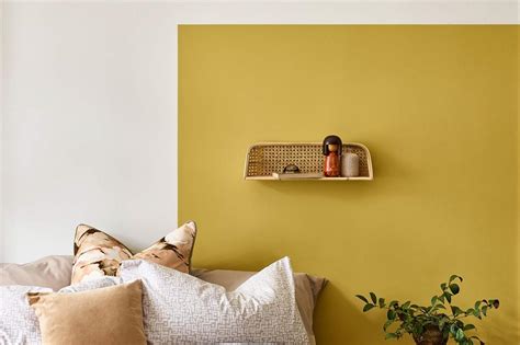 For a bold and contemporary look, consider a mustard yellow feature wall, like Dulux Golden Sands , against charcoal gray walls. This pairing is energetic and eye-catching, perfect for adding a pop of color to a living room or dining area. The mustard yellow brings warmth and vibrancy, while the charcoal gray provides a grounding contrast. Accessorize with geometric patterns and metallic accents to complete the modern vibe.