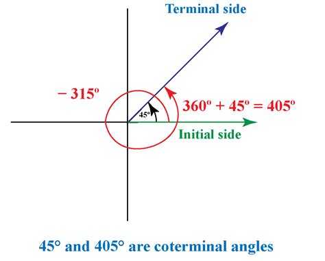 Lastly, consider an angle greater than 360 degrees, like 405 degrees. This means you complete a full rotation (360 degrees) and then go an additional 45 degrees. So, the terminal side will be in the first quadrant, exactly where the terminal side of a 45-degree angle would be.