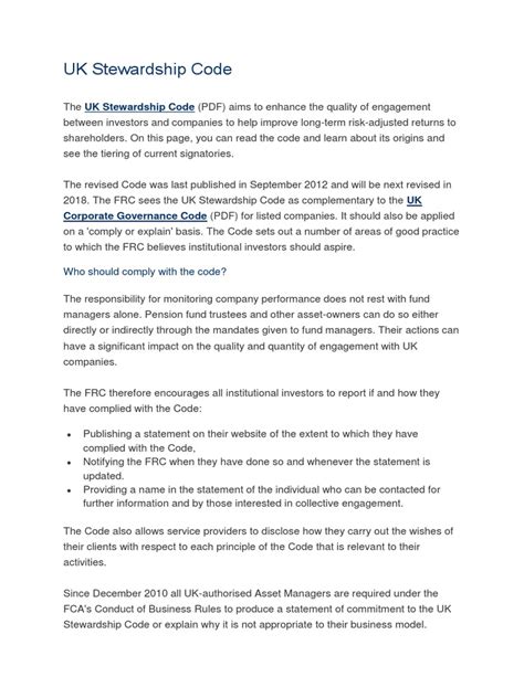 Hey guys, let’s dive into something super important for anyone involved in investing: the UK Stewardship Code . Now, you might be thinking, “What exactly is this code, and why should I care?” Well, strap in, because we’re going to break it all down. At its core, the UK Stewardship Code is all about encouraging investors to be more responsible and engaged with the companies they invest in. It’s not just about buying stocks and hoping for the best; it’s about actively participating in the success and sustainability of those companies. Think of it as a set of principles that guide institutional investors – like pension funds, asset managers, and insurance companies – on how to properly exercise their ownership rights. This code was developed by the Financial Reporting Council (FRC) and has been updated over the years to reflect evolving market practices and societal expectations. The main goal? To improve the quality of engagement between investors and companies, ultimately leading to better long-term returns for savers and beneficiaries, and a more sustainable economy for everyone. It encourages transparency, accountability, and a focus on long-term value creation rather than short-term gains. We’ll explore the key principles, who it applies to, and why it’s becoming increasingly vital in today’s investment landscape. So, whether you’re an investor yourself, work for a company that seeks investment, or are just curious about how the financial world operates more ethically, this guide is for you!
