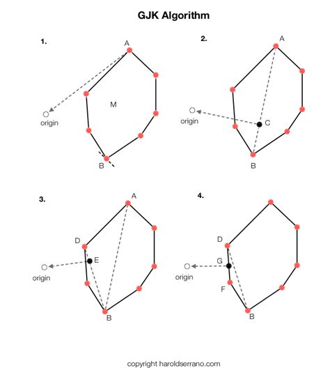 Alright, so we’ve got a general idea of what the GJK algorithm does , but how does it actually work ? This is where things get a bit more technical, but don’t worry, we’ll keep it as clear as possible. The core idea revolves around the Minkowski difference and a concept called the support mapping . Remember how we mentioned GJK works with convex shapes? That’s key here. Convexity means that if you pick any two points inside the shape, the line segment connecting them is also entirely within the shape. Think of a ball or a cube – no dents or holes. The algorithm cleverly avoids directly checking for overlap. Instead, it uses the support mapping function. For a given direction (a vector), the support mapping function tells you which point on a convex shape is furthest away in that direction. Imagine shining a flashlight from a specific angle onto a ball; the support mapping would give you the point on the ball that’s hit last by the light. GJK uses this by querying the support mapping for both shapes. Specifically, it looks at the support mapping of shape A in direction d and the support mapping of shape B in direction -d . The difference between these two points gives you a point on the Minkowski difference of the two shapes. The goal is to determine if the origin (the point [0,0,0]) lies within this Minkowski difference. If the origin is inside, the shapes intersect. If it’s outside, they don’t. The GJK algorithm iteratively constructs a simplex. A simplex is the simplest possible geometric shape: a point in 1D, a line segment in 2D, a triangle in 3D, and a tetrahedron in 3D. The algorithm starts with a simplex, often just a single point, and in each step, it finds a new point to add to the simplex. This new point is chosen by querying the support mappings of the two shapes in a direction that tries to move the shapes closer together. The direction is typically chosen to move the current simplex away from the origin. As the algorithm progresses, the simplex grows, and it tries to enclose the origin. If the origin becomes part of the simplex, or if the simplex can be reduced to contain the origin, then we know the shapes are colliding. Conversely, if at any point the algorithm can determine that the origin cannot be contained within the growing simplex, regardless of how it expands, then it concludes that the shapes are not colliding. This is the power of GJK – it can quickly rule out non-collisions. A crucial part of the algorithm is handling the simplex updates. Depending on which points are added to the simplex and how they relate to the origin, the algorithm might need to remove points or adjust the simplex to ensure it remains as small as possible while still containing the necessary information. This process is repeated until a termination condition is met: either collision is detected (origin is in the simplex) or non-collision is detected (origin cannot be in the simplex). This iterative refinement makes GJK incredibly efficient, especially for complex geometries where traditional intersection tests would be computationally prohibitive. It’s like a smart search that focuses on the most relevant parts of the shapes, gradually homing in on whether they’re about to kiss or give each other a wide berth. Pretty cool, right?