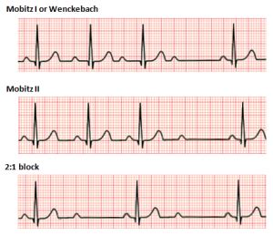 So, on the ECG strip, you’ll see regular P waves marching along. Most of these P waves will be followed by a QRS complex, and the duration of the PR interval for these conducted beats will be the same each time. However, every now and then, you’ll see a P wave that just… disappears. It’s not followed by a QRS complex. There’s no preceding progressive lengthening of the PR interval. This dropped beat creates a pause, and when you measure the duration of this pause, it’s usually about twice the duration of a normal R-R interval (the time between two consecutive QRS complexes).