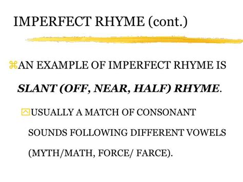 Okay, so what exactly is imperfect rhyme? The imperfect rhyme , at its core, is a type of rhyme where the sounds are similar, but not identical. Think of it as rhyming cousins, not rhyming twins. Unlike perfect or full rhymes, where the vowel and consonant sounds match exactly (like “cat” and “hat”), imperfect rhymes play around with those sounds. The vowel sounds might be different, the consonant sounds might be slightly off, or maybe just the stress on the syllables is a bit wonky. The key is that there’s a noticeable difference, but the words still create a sense of connection. Why would anyone use this? Well, imperfect rhyme opens up a whole new world of possibilities for poets and songwriters. It allows for more flexibility in word choice, making it easier to express complex ideas and emotions. It can also create a sense of unease, tension, or ambiguity, adding layers of meaning to the work. Imagine the possibilities of subtly linking words that don’t quite fit, creating a feeling of subtle discord or unexpected harmony. That’s the power of imperfect rhyme. It’s all about suggestion, implication, and the art of the almost-but-not-quite.