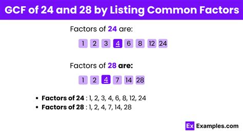 • Common factors of 24 and 28 are 1, 2, and 4.