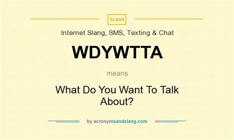 Okay, so what exactly does WDYWTTa mean? Drumroll, please… it stands for “ What do you want to talk about ?” Yep, it’s that simple! This acronym is a conversation starter, an invitation to delve into a specific topic, or a way to steer a chat in a new direction. Think of it as a friendly nudge, prompting the other person to share their thoughts or feelings. It’s a convenient way to kick off a discussion without the formality of a full sentence. Its popularity comes from its brevity and efficiency, perfect for the fast-paced nature of texting. You will often see it used by people who are trying to be straightforward and clear in their communications.